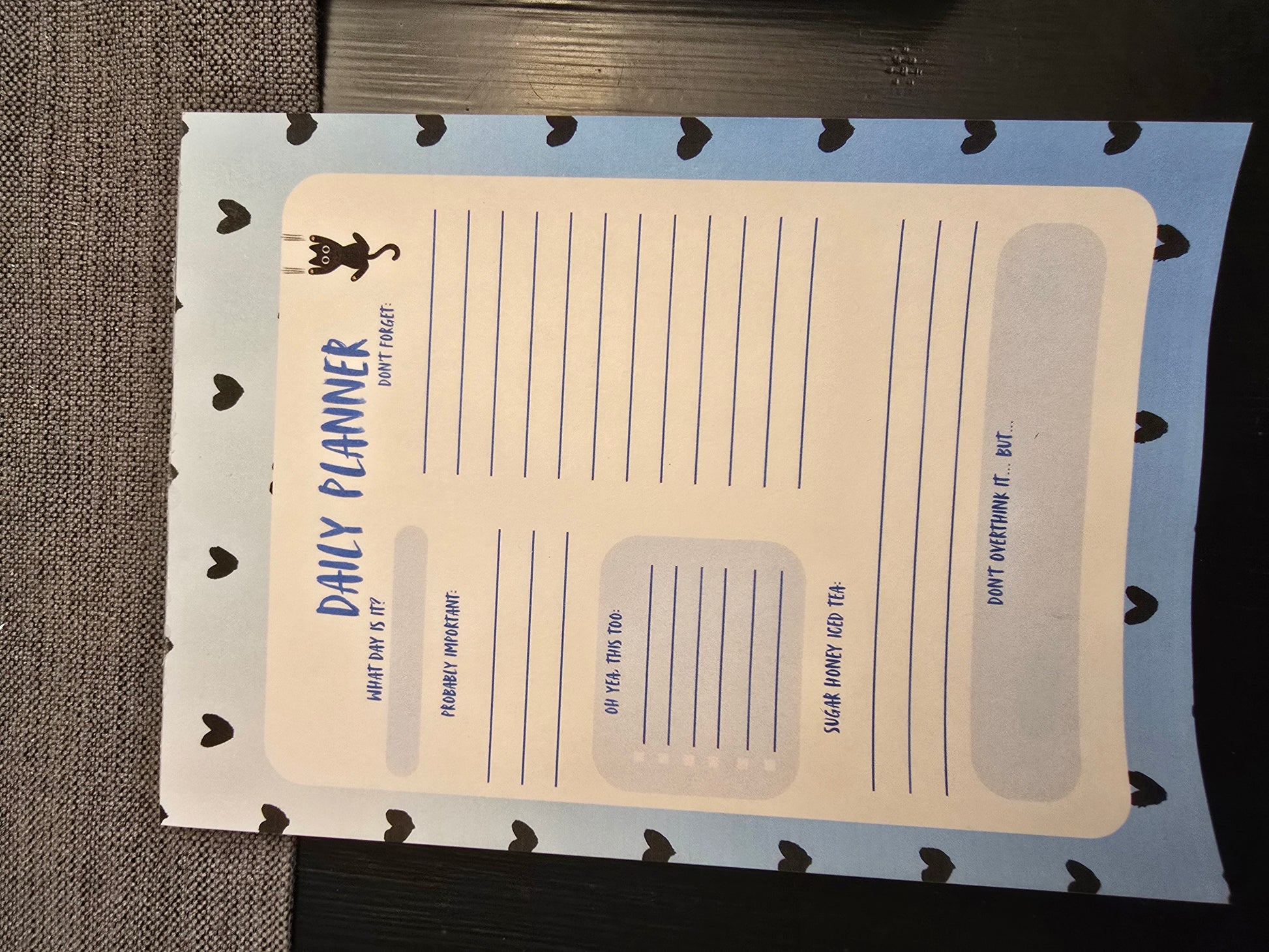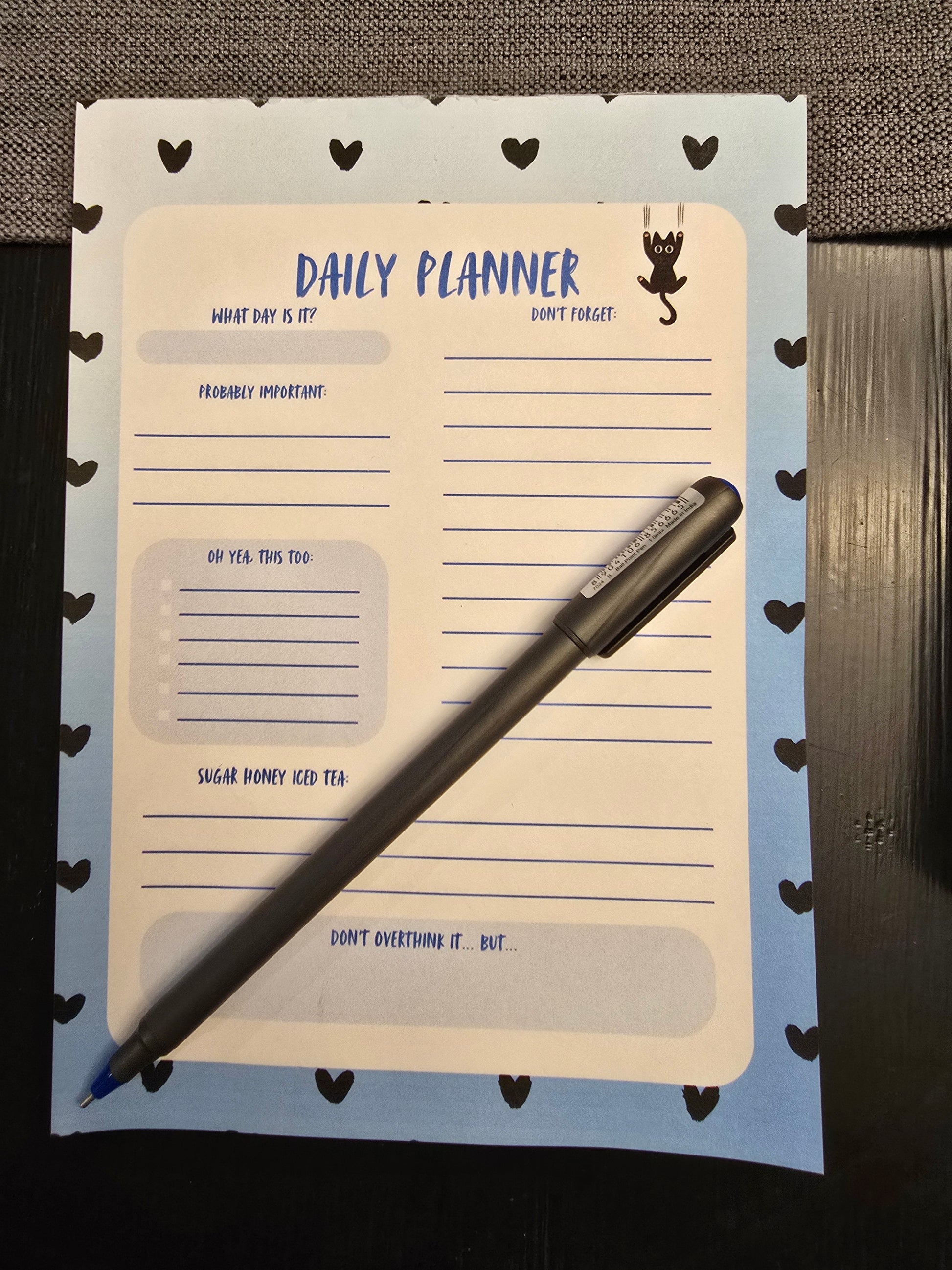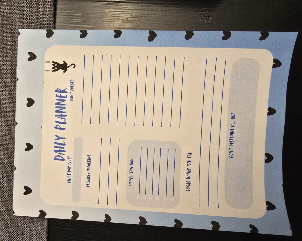 Daily Planner blue and black with a cute cat. Mainly for things we keep forgetting and may or may not be important š