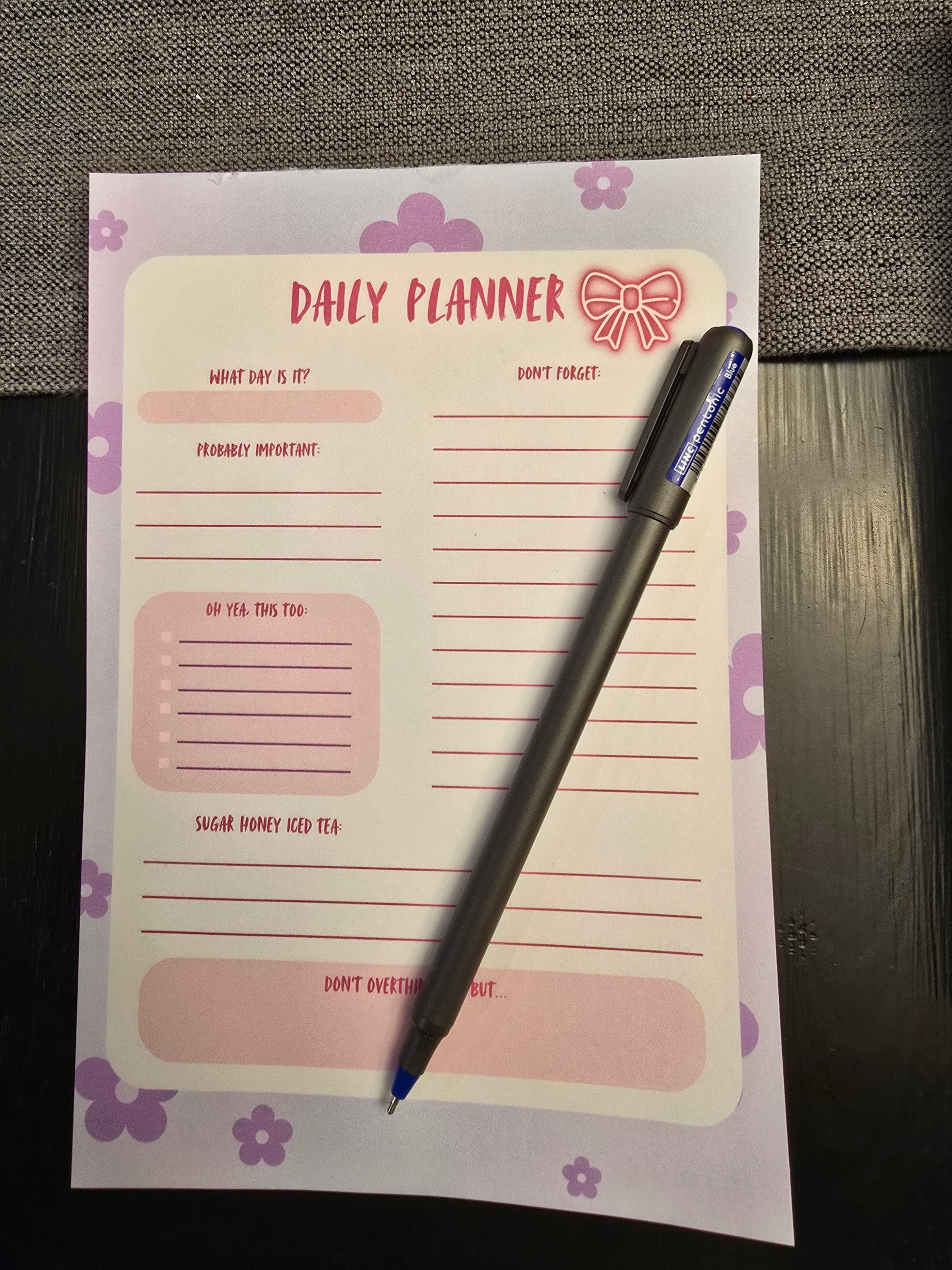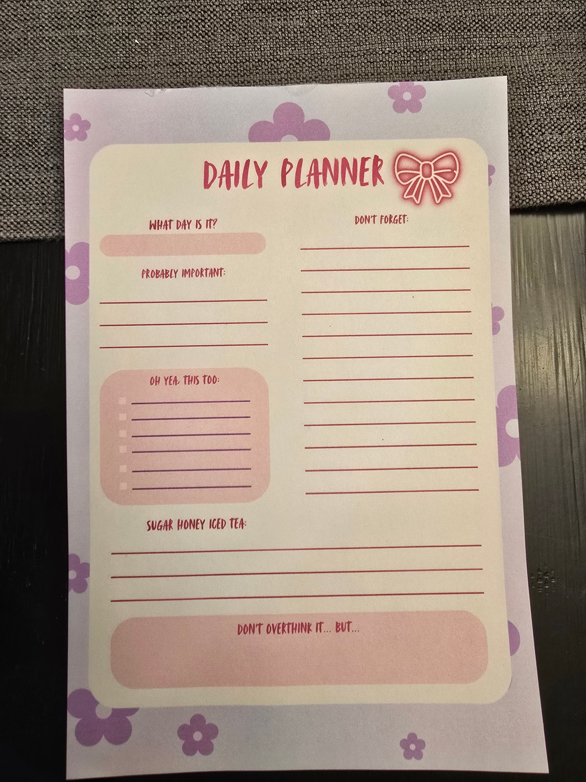 Daily Planner pink flowers and pink bow. Mainly for things we keep forgetting and may or may not be important 😉