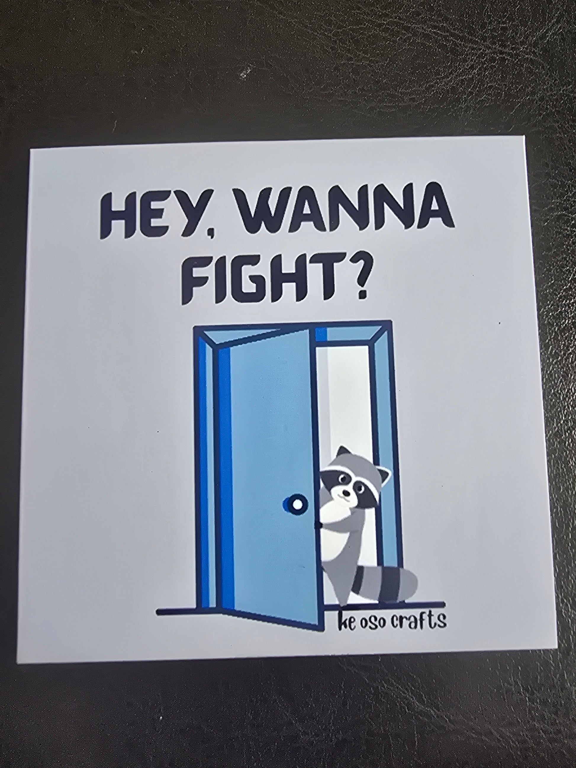 Ready to throw hands... or just peek out and see if you’re up for it? This 3" x 3" magnet features a mischievous raccoon sticking its head out of a blue door, daring you to say, “Hey, wanna fight?” It’s a perfect mix of cute and sassy, just like that friend who’s ready to rumble but also wants to keep things lighthearted.