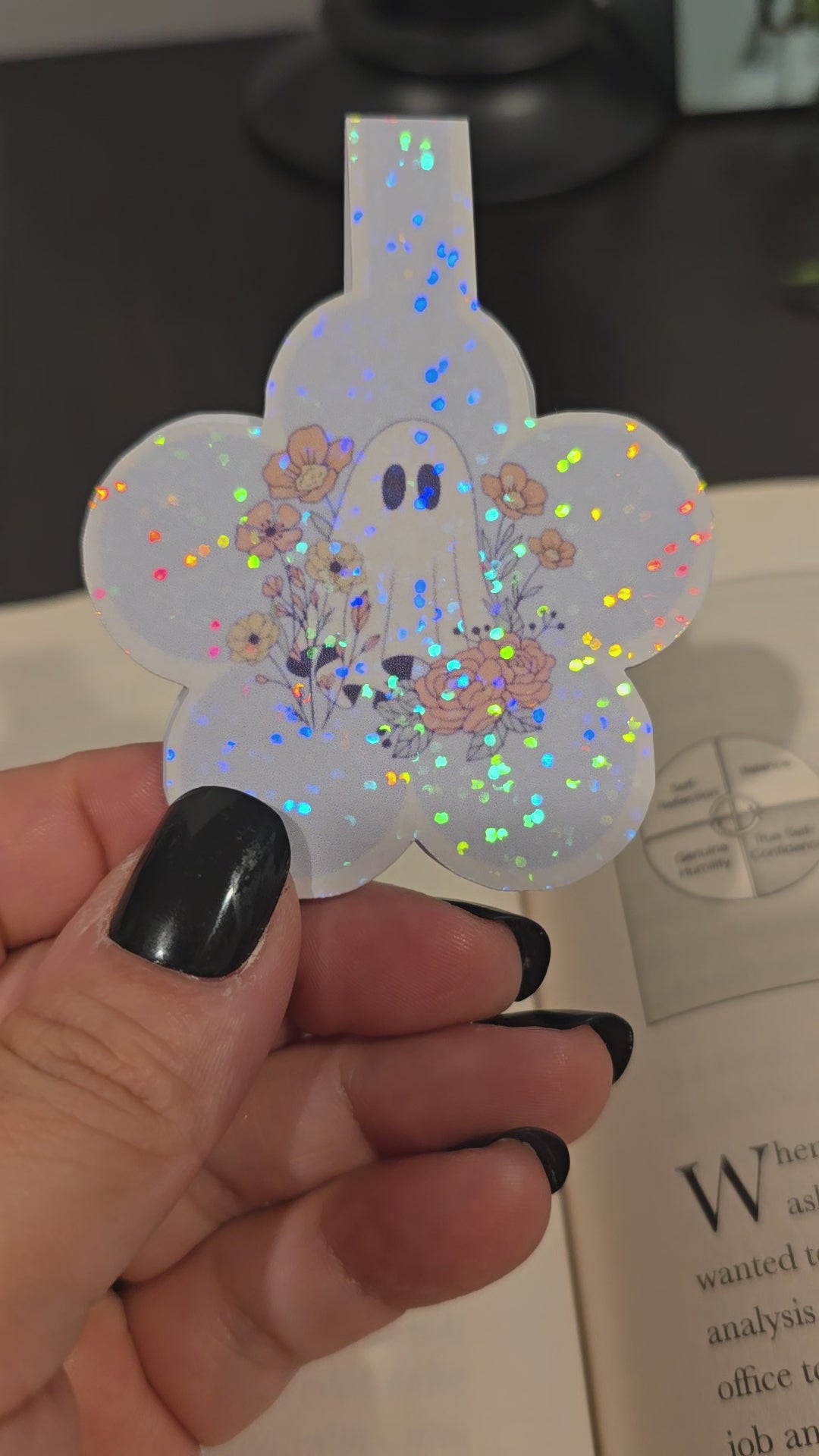 Add a little spirit to your reading routine with this flower-shaped ghost bookmark! Surrounded by a bouquet of delicate flowers, this cute ghost is all about spreading love and good vibes. Laminated for durability with a holographic touch, itβs a whimsical way to keep your page and your heart in the right place.