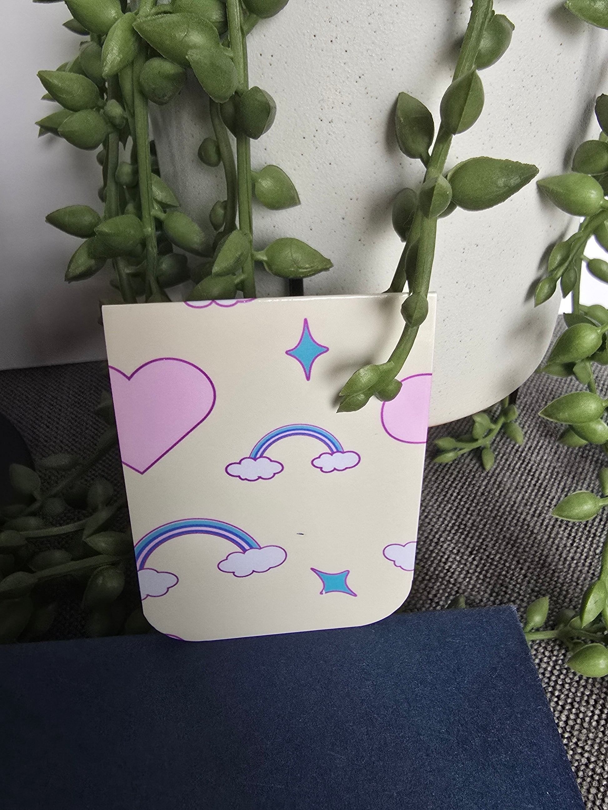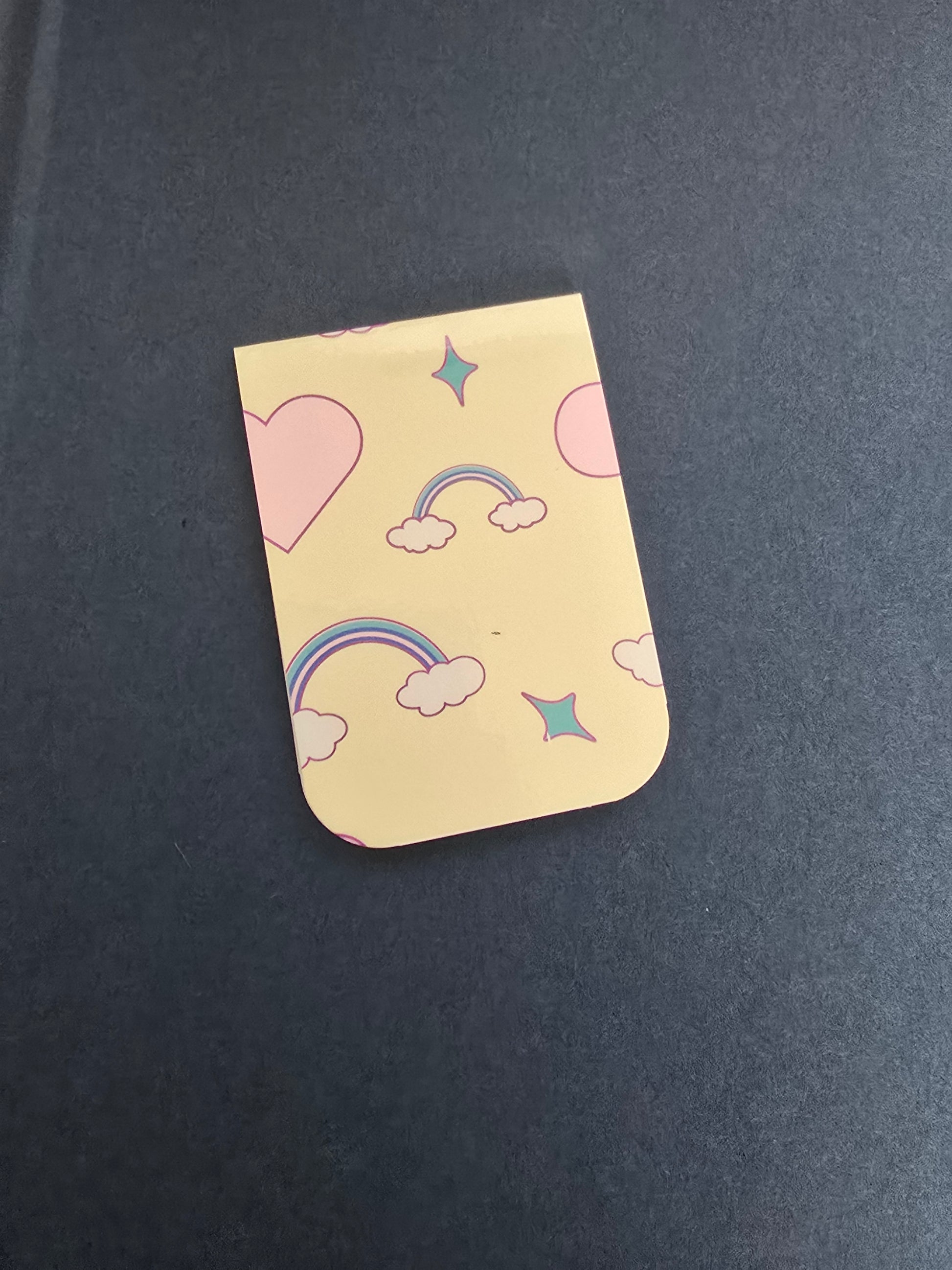 Brighten up your page with this sweet and simple magnetic bookmark! Featuring pastel rainbows, pink hearts, and a sunny yellow background, it’s like a tiny dose of happiness for your book. Folded, it measures about 2.5" x 2"—small, sturdy, and seriously adorable.