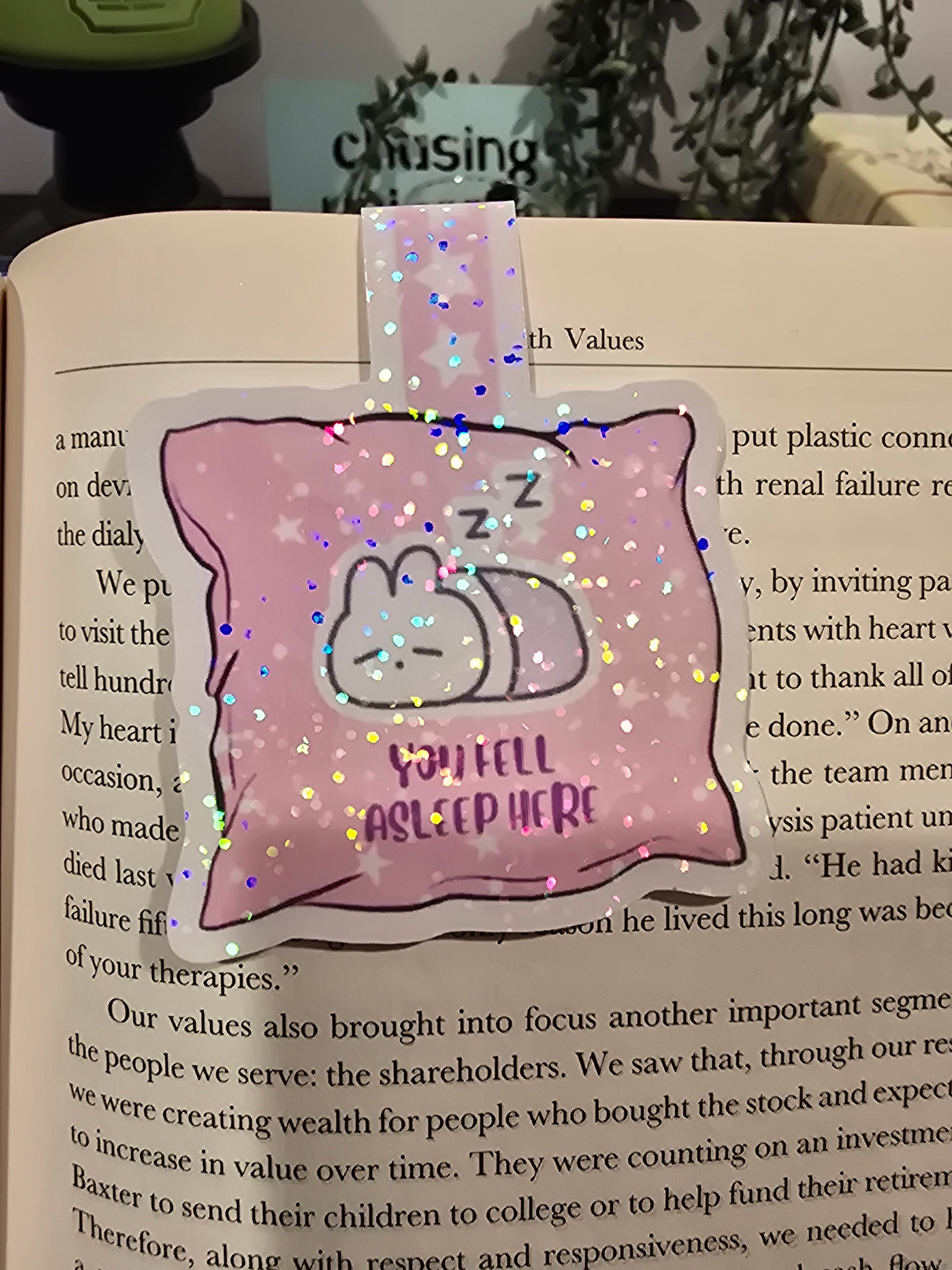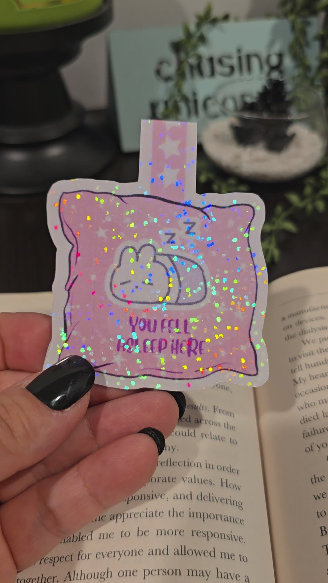 Oops… did someone doze off mid-chapter? This adorable sleepy bunny has you covered! Shaped like a tiny napping bunny with a fluffy pillow and the phrase “You fell asleep here,” it’s the perfect companion for cozy reading sessions and accidental naps. Laminated for durability with a dreamy holographic touch—because even sleepy bunnies deserve a little sparkle.