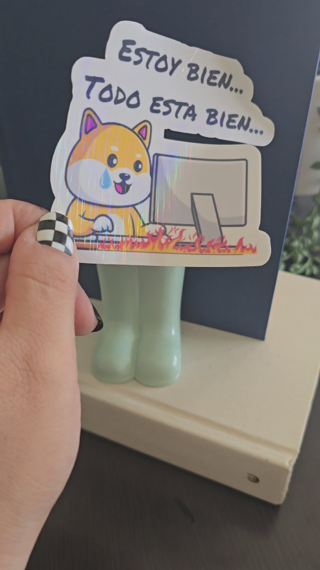 "Tamaño del sticker: 3.25x3.70 pulgadas. Vibra: Holográfico con una dosis de ‘todo está bien’… pero no lo está. ‘Estoy bien, todo está bien’ muestra a un perrito llorando (pero con sonrisa forzada) mientras una computadora se quema de fondo. Porque, ¿quién no se siente así cuando todo va mal pero tienes que seguir diciendo ‘estoy bien’? Perfecto para esos días en los que todo está hecho un desastre, pero al menos tienes sentido del humor para reírte de ello.