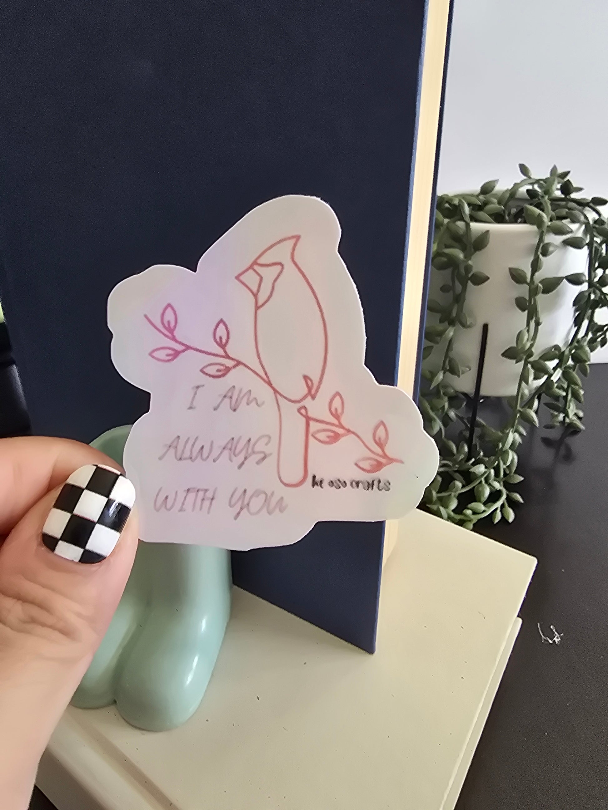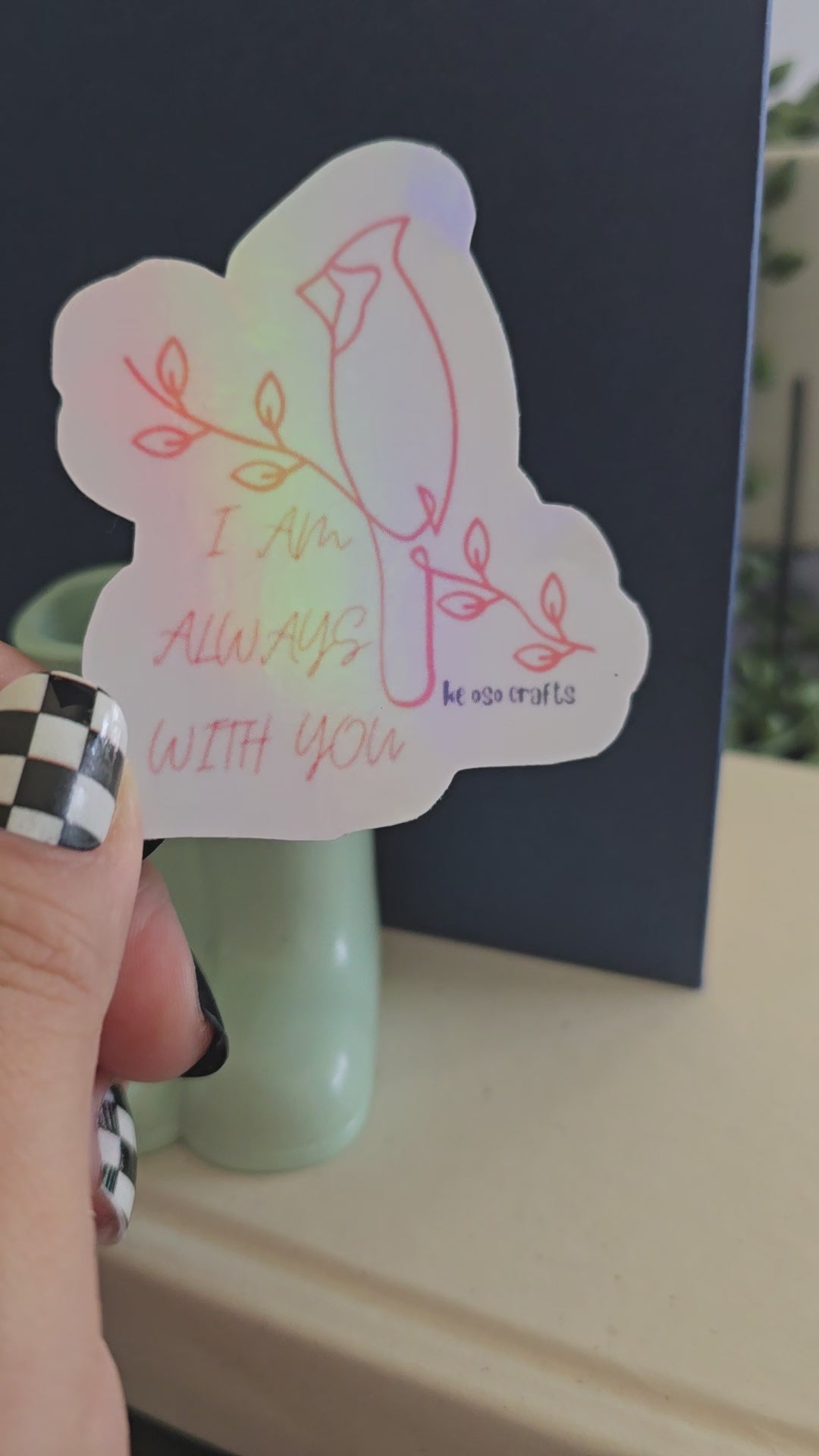 Sticker size: 2.5x2.5 inches. Vibe: Holographic warmth with a touch of comfort. ‘I Am Always With You’ features a beautiful cardinal, symbolizing love, guidance, and strength. This sticker is a gentle reminder that no matter the distance, support and care are always close by.