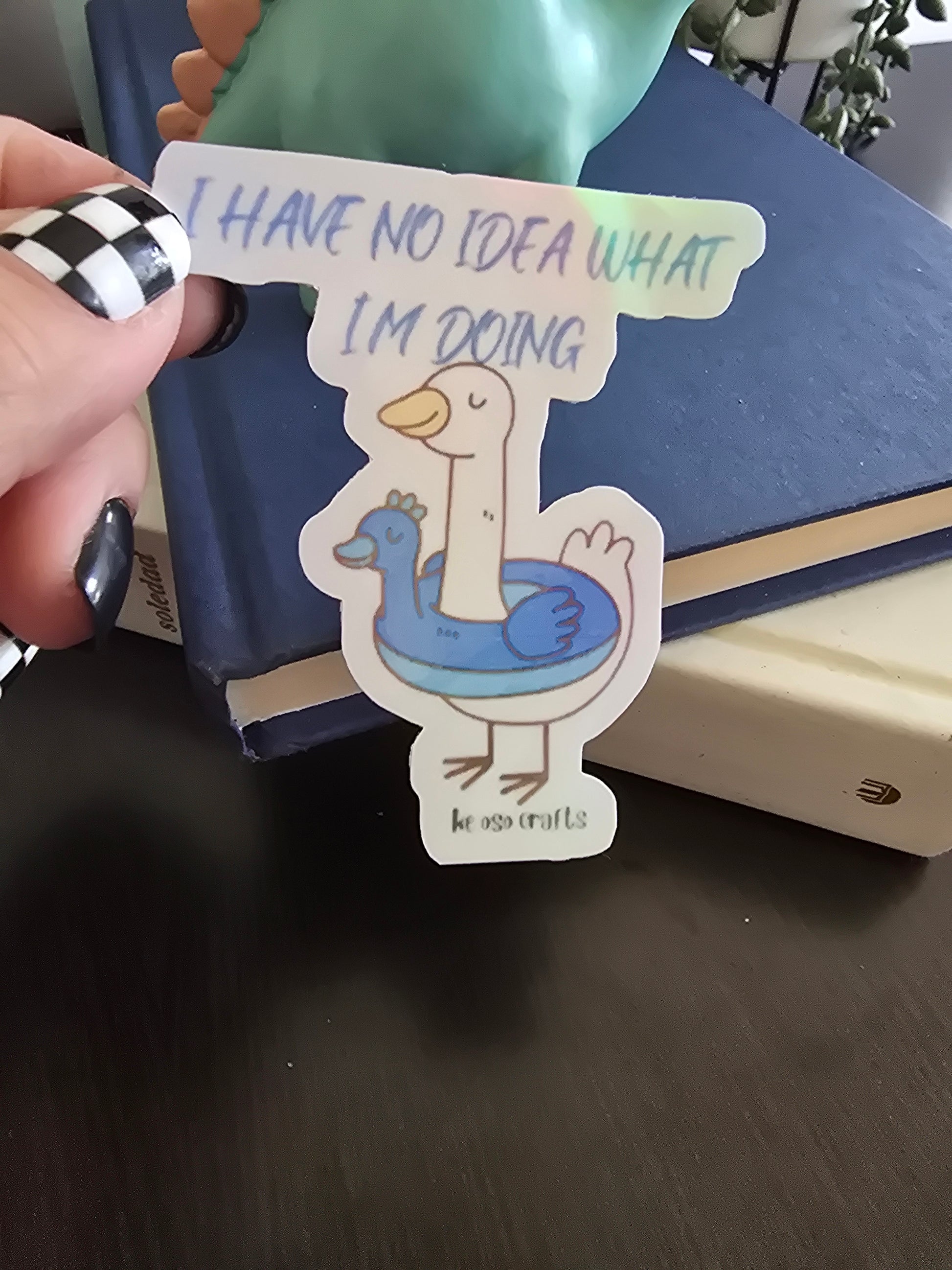 Sticker size: 3x2.5 inches. Vibe: Holographic confusion with a side of 'who’s in charge here?' This little duck might be floating through life with absolutely no idea what's going on, but at least he’s doing it in style. Perfect for when you’re just winging it and hoping no one notices. For those ‘I have no idea what I’m doing’ moments—you're not alone, this duck gets it.
