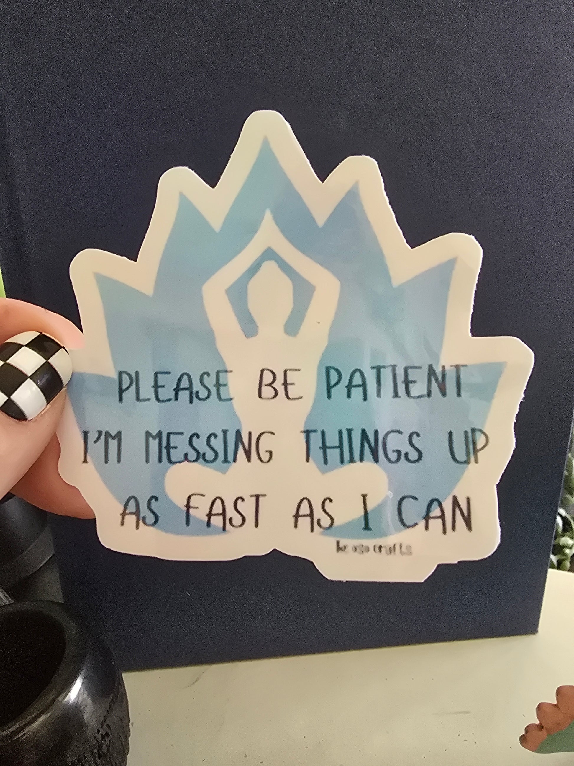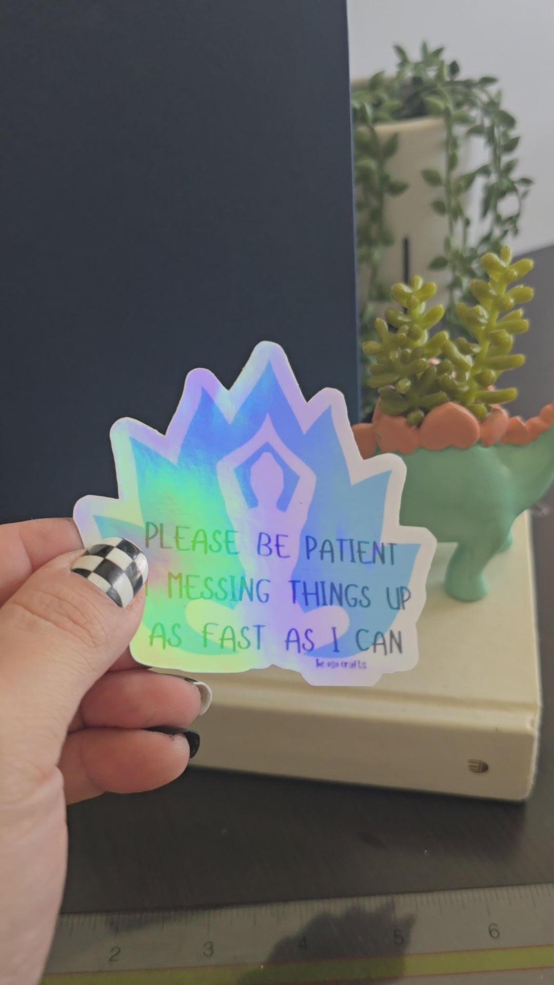 Sticker size: 3.5x3 inches. Vibe: Holographic vinyl with a touch of honesty. This sticker humorously captures the feeling of juggling tasks while still managing to make mistakes along the way. ‘Please be patient. I’m messing things up as fast as I can’ is a lighthearted reminder that sometimes progress involves a little chaos.